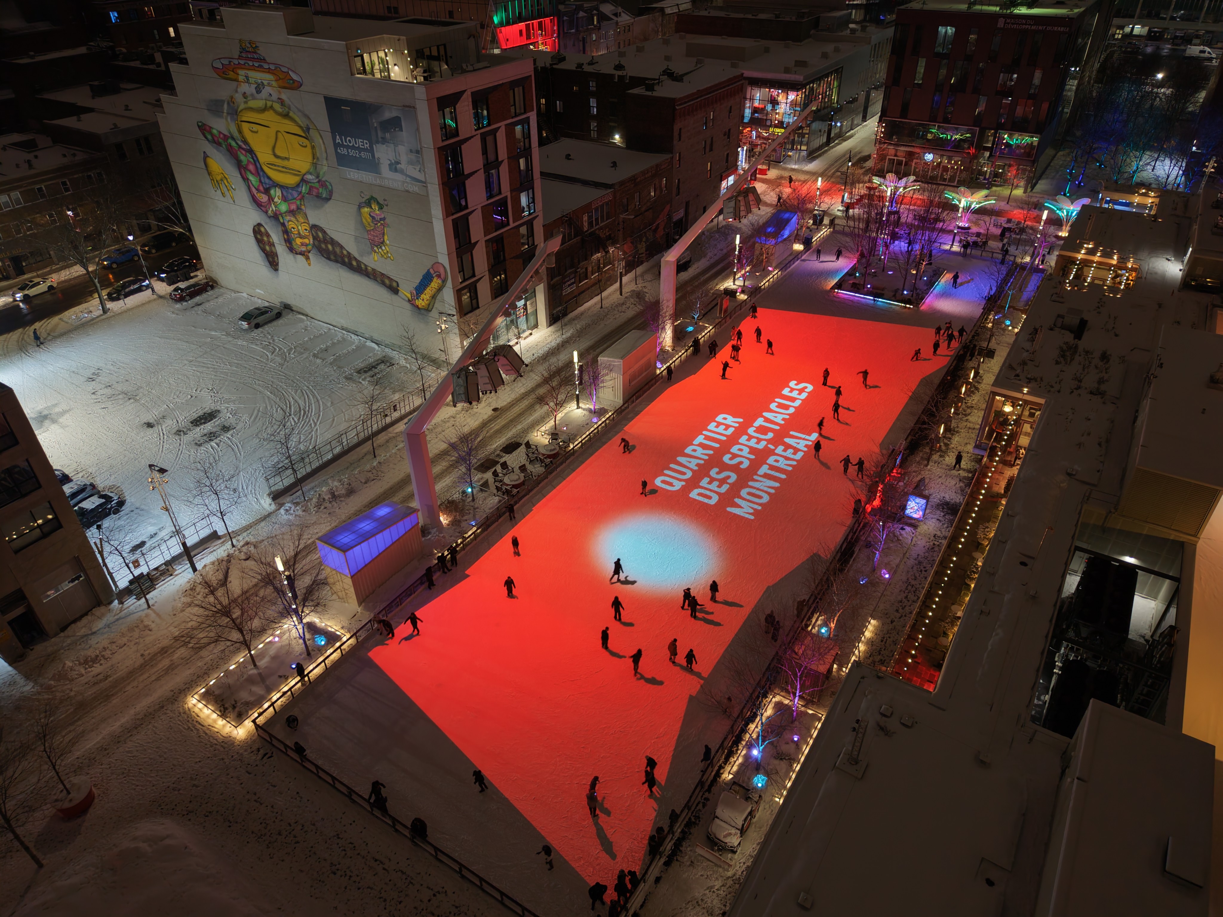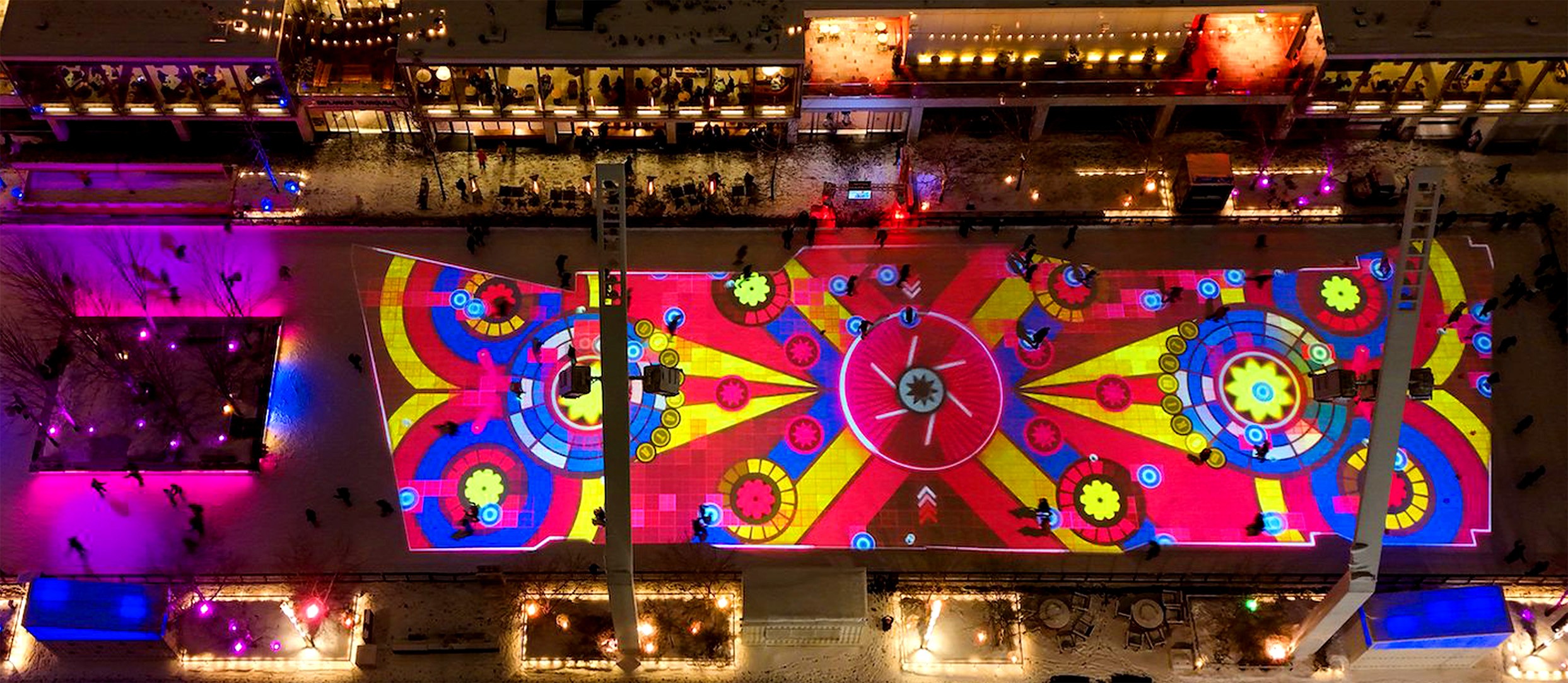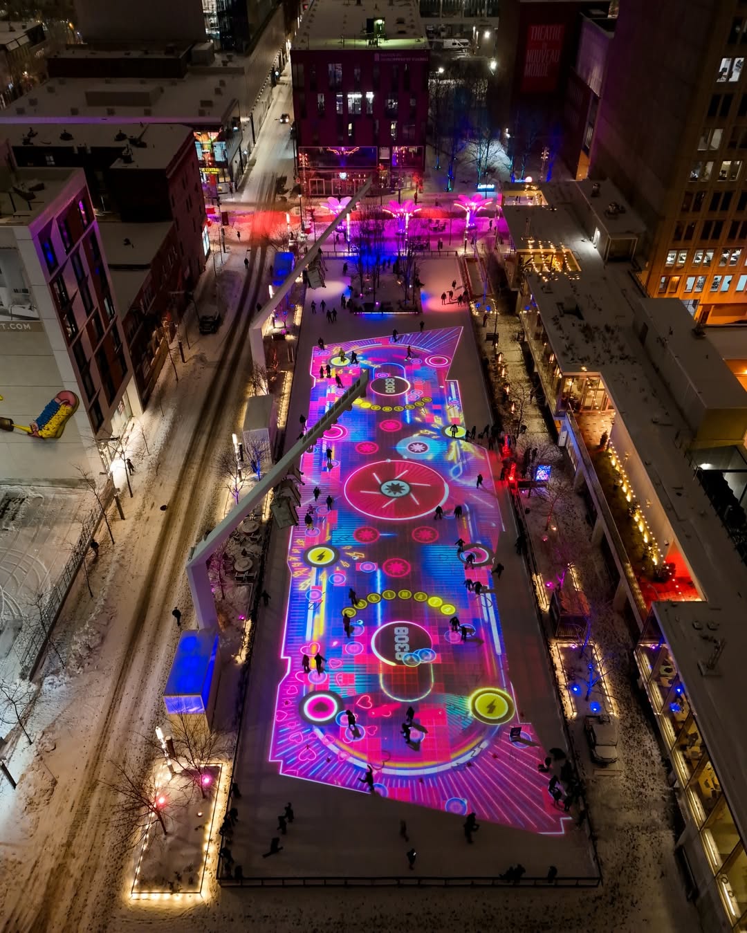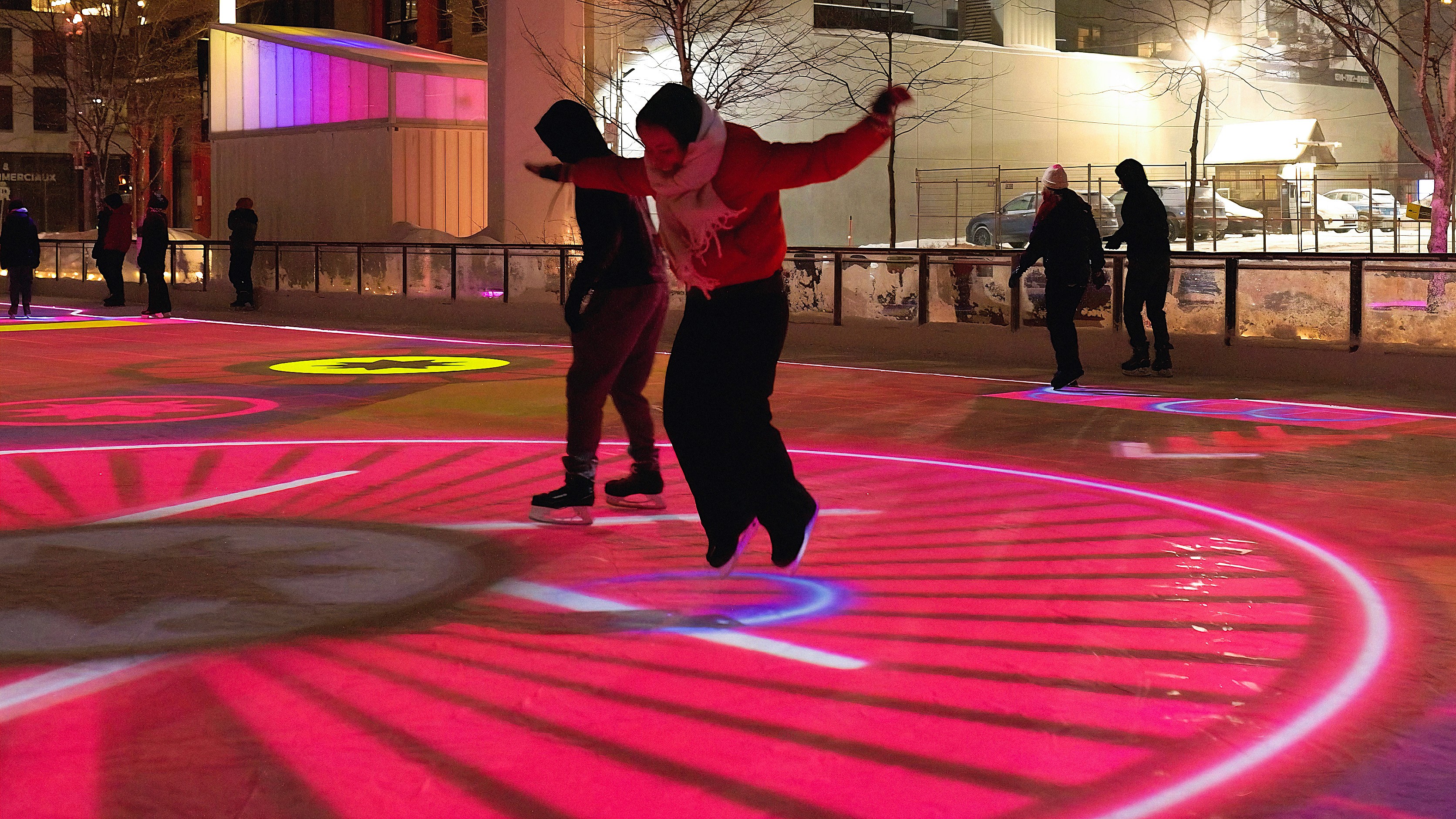 Created for LUMINO at Montréal’s Esplanade Tranquille, The Unfrozen Toy Box reimagines the outdoor skating rink as a large-scale interactive experience where movement, light, and play converge. The installation invites skaters to move through a series of visual worlds evolving in real time beneath their blades, turning the ice into a playful, living playground.